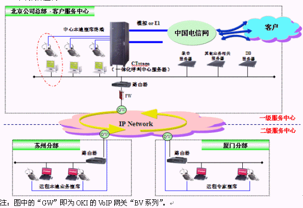 另一方面,OKI則擁有構(gòu)筑大規(guī)模IP電話的豐富經(jīng)驗(yàn),從最初的窄帶網(wǎng)絡(luò)到最近的寬帶網(wǎng)絡(luò),OKI一直在提供著最適合使用用戶環(huán)境的、追求音質(zhì)的VoIP產(chǎn)品。伴隨著寬帶網(wǎng)絡(luò)在企業(yè)市場中日益深入的運(yùn)用,及呼叫中心市場中呈現(xiàn)的最新需求,OKI充分將IP技術(shù)運(yùn)用到呼叫中心系統(tǒng)中,推出IP型分散客服中心解決方案。所謂分散型系統(tǒng),是指用網(wǎng)絡(luò)將分散在各個點(diǎn)的多個呼叫中心連接起來,作為一個大規(guī)模中心統(tǒng)一運(yùn)用的系統(tǒng)。