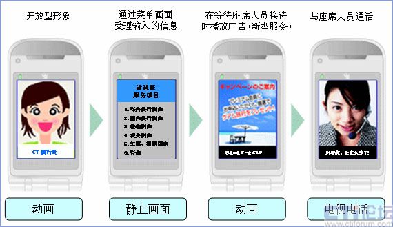 以往的IVR根據(jù)選擇項(xiàng)、層數(shù),必須多遍聽取語音內(nèi)容才能找到預(yù)期的菜單,成了一大課題。視頻呼叫中心則在FOMA的畫面上顯示服務(wù)菜單,通過選擇號(hào)碼可以簡(jiǎn)化聽取語音的過程。而且,在連接客服人員的電話等待時(shí)間中可以播放廣告。通過靈活運(yùn)用這些功能,提高了IVR的操作性,提供了新型廣告宣傳的機(jī)會(huì)。