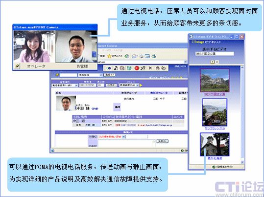 通過“FOMA”的電視電話服務(wù),可以實(shí)現(xiàn)面對(duì)用戶的表情進(jìn)行服務(wù)。而且,例如,可以實(shí)時(shí)把握故障發(fā)生地點(diǎn)等只用語言無法準(zhǔn)確傳遞的信息。進(jìn)而,客服人員可以通過FOMA的電視電話功能送出動(dòng)畫、靜止畫面,利用這些畫面說明情況。通過靈活運(yùn)用這些功能,為實(shí)現(xiàn)顧客和企業(yè)之間的熱情友好、高效細(xì)致的通信提供支持。