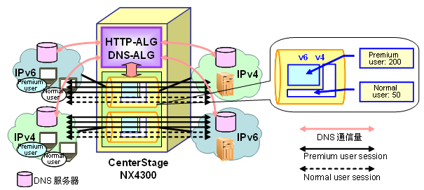 可以在ALG 服務(wù)器刀片上搭載將DNS咨詢進(jìn)行IPv6-IPv4轉(zhuǎn)換的ALG功能。與轉(zhuǎn)換服務(wù)器刀片協(xié)作可以實(shí)現(xiàn)IPv6與IPv4的雙方向通信。