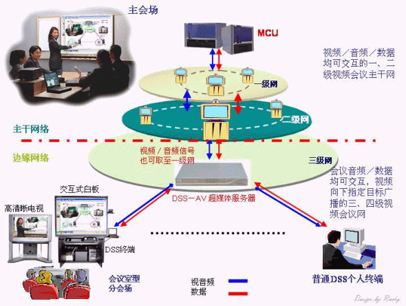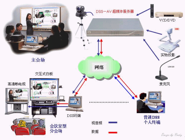 DSS超媒體視訊系統(tǒng)是以主會場為中心,通過結(jié)合視頻、音頻、數(shù)據(jù)及網(wǎng)絡(luò)通訊技術(shù),同時與多個分會場進行交流,其效果如同在一間大會議室開會一樣。參與會議的成員能實時交流會議內(nèi)容(文字、圖片等),并對其進行注釋和修改。能夠高效率地進行文件傳送、方案討論、工作匯報、遠程教學(xué)等各種會議。