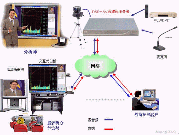 證券公司股評分析師利用DSS超媒體視訊系統(tǒng)的PPT演講、應(yīng)用程序共享、IE協(xié)同瀏覽和電子白板等功能,通過網(wǎng)絡(luò)向投資人進行證券分析。不同版塊(指數(shù)分析、版塊輪動、個股點評等)建立不同會議室方式,也可以以點評師的名字建會議室,供投資人選擇服務(wù)。各證券營業(yè)所投資人因此得到實時的操作指導(dǎo)。部分股評師利用DSS超媒體視訊系統(tǒng)還可以在internet開設(shè)有點評服務(wù)。