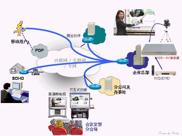 某跨地區(qū)生產(chǎn)企業(yè),總部及生產(chǎn)工廠在東莞、設(shè)計所在廣州、樣本設(shè)計所在香港,研發(fā)機構(gòu)在美國。全國各省市有上百家專賣店,其中重點賣場有三十余家。設(shè)計所、工廠、重點賣場通過DSS超媒體通訊系統(tǒng)的音、視頻及數(shù)據(jù)功能進行交流溝通,市場部通過該系統(tǒng)可以進行全國性的培訓(xùn)、交流,并應(yīng)用于產(chǎn)品展示。