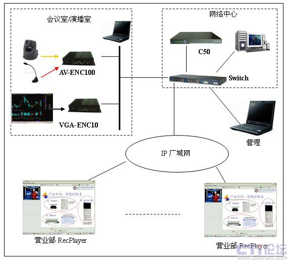 在分析了海通證券的實(shí)際需求和網(wǎng)絡(luò)環(huán)境以后,決定采用一套DSS-R-C50+來(lái)組建整個(gè)媒體廣播系統(tǒng)。系統(tǒng)由媒體采集系統(tǒng)AV-ENC100/VGA-ENC100,流媒體處理和錄制系統(tǒng)C50和媒體接收系統(tǒng)RecPlayer組成。通過(guò)此系統(tǒng)可以實(shí)現(xiàn)語(yǔ)音、視頻和計(jì)算機(jī)桌面的同步實(shí)時(shí)直播、錄制和點(diǎn)播。系統(tǒng)的結(jié)構(gòu)圖如下: