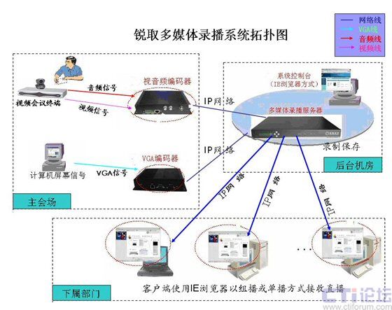 如上圖所示,硬件系統(tǒng)采用了前后臺(tái)分離的模式,前端的視音頻編碼器將從終端上采集的視音頻信號(hào)與VGA編碼器采集的VGA信號(hào)進(jìn)行編碼,通過(guò)內(nèi)部專(zhuān)屬網(wǎng)絡(luò)傳輸?shù)胶笈_(tái)機(jī)房的錄播服務(wù)器中,通過(guò)服務(wù)器內(nèi)部功能模塊,不僅將整個(gè)會(huì)議或者培訓(xùn)現(xiàn)場(chǎng)的視音頻與電腦桌面內(nèi)容同步錄制保存在專(zhuān)屬硬盤(pán)中,同時(shí)將上述采集內(nèi)容實(shí)時(shí)轉(zhuǎn)發(fā)直播到用戶(hù)局域網(wǎng)中。通過(guò)錄播系統(tǒng)的身份驗(yàn)證機(jī)制,通過(guò)連接到網(wǎng)絡(luò)中的任意一臺(tái)PC即可接收直播的內(nèi)容。同時(shí)錄制保存在專(zhuān)屬硬盤(pán)上的內(nèi)容還可以后期點(diǎn)播回訪(fǎng)(需身份驗(yàn)證)。