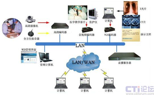 同時,銳取多媒體系統(tǒng)前端VGA編碼器將采集到的計算機(jī)信號(包含通過網(wǎng)絡(luò)訪問的DR/CR片、CT片)進(jìn)行實時編碼和壓縮,通過網(wǎng)絡(luò)與高清視音頻信號以及普通視音頻信號同步傳輸?shù)戒J取多媒體錄播系統(tǒng)遠(yuǎn)程醫(yī)療系統(tǒng)后臺服務(wù)器上。