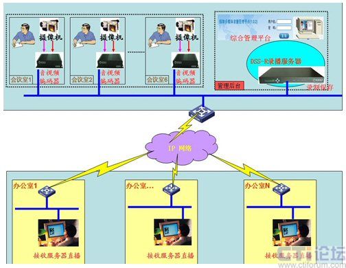 基于上述的需求,經(jīng)過(guò)調(diào)研選用深圳銳取錄播服務(wù)器產(chǎn)品完成上述的功能需求。如圖所示,通過(guò)放置在每個(gè)會(huì)議室考場(chǎng)內(nèi)的攝像機(jī),將竟聘者的圖像與聲音傳輸?shù)较噙B接的銳取公司的視音頻編碼器上,通過(guò)編碼器的編碼將采集的信號(hào)(通過(guò)內(nèi)部網(wǎng)絡(luò))傳輸?shù)胶笈_(tái)的管理平臺(tái)上的DSS-R錄播服務(wù)器中。服務(wù)器的直播模塊將從音視頻編碼器接收到的信號(hào)分發(fā)到網(wǎng)絡(luò)中,每個(gè)接入內(nèi)網(wǎng)絡(luò)的辦公室內(nèi)里的電腦通過(guò)專有客戶端接收考場(chǎng)實(shí)時(shí)內(nèi)容,實(shí)現(xiàn)了真正意義上的接受機(jī)關(guān)廣大干部群眾的監(jiān)督考察。同時(shí)錄播服務(wù)器內(nèi)置的錄制模塊,將收到的信號(hào)內(nèi)容解碼錄制保存(服務(wù)器內(nèi)有可供存儲(chǔ)的硬盤(pán)),為日后干部的選擇做到了有理可依,有據(jù)可查。