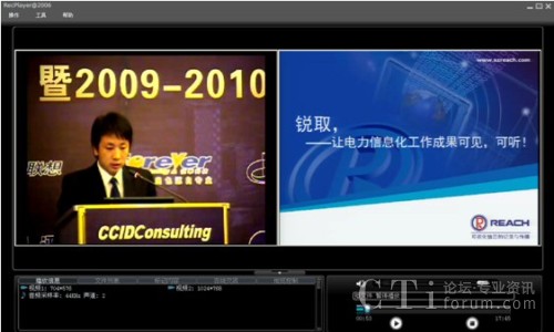本次論壇分為電力企業(yè)信息化高峰論壇、電力企業(yè)“十二五”信息化藍圖展望、電力信息化標桿研究及評選結(jié)果發(fā)布、研討國際電力信息化標桿發(fā)展方向、研討“智能”落地打造中國智能特色五大議題。深圳銳取受主辦方委托為論壇提供全程錄播服務。相比傳統(tǒng)攝像機記錄會議的方式,銳取多媒體錄播系統(tǒng)實現(xiàn)了會議現(xiàn)場視頻與講演者PPT同步完整記錄,新穎的記錄方式受到了主辦單位和與會者的好評。