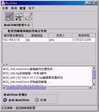 此窗口主要用來顯示Mail2SMS與所監(jiān)控郵箱的連接狀態(tài),及啟動與關閉Mail2SMS的監(jiān)控功能。如上圖所示點擊