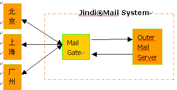 如果選用Jindi?Mail作為外部郵件服務(wù)器,可以在同一臺外部郵件服務(wù)器上配置可選的MailGate模塊,該模塊可以將指定域用戶的郵件進(jìn)行定向投遞,而不依賴DNS的配置。內(nèi)部郵件通過內(nèi)部DNS在郵件網(wǎng)關(guān)處進(jìn)行存儲轉(zhuǎn)發(fā)到外部。