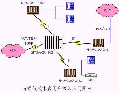 tyutSPAS-2000可編程交換機(jī)通過E1可以支持多個遠(yuǎn)端模塊。遠(yuǎn)端模塊采用SPAS-2000 SAS框,可以帶多種用戶接口:普通模擬用戶、DDN、環(huán)路中繼用戶;通過SPAS-2000 DTS對外提供各種信令接入。適合多點接入組網(wǎng),組網(wǎng)成本低廉。 在示意圖中,SAS表示遠(yuǎn)端用戶接入框,它可以通過需要選擇接入模擬用戶:FXO/FXS、E/M、普通模擬用戶和DDN。中心為SPAS可編程交換機(jī),可以通過 SS7/PRA/R2MF進(jìn)行匯接轉(zhuǎn)換。