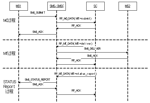 上圖是表示出了一個(gè)移動臺MS1向另一移動臺MS2發(fā)送短消息的典型過程,圖中忽略了MSC、HLR、BS等功能實(shí)體,重點(diǎn)說明的是MO、MT、StatusReport三個(gè)典型過程中,SMS-GMS與SC之間的消息序列。