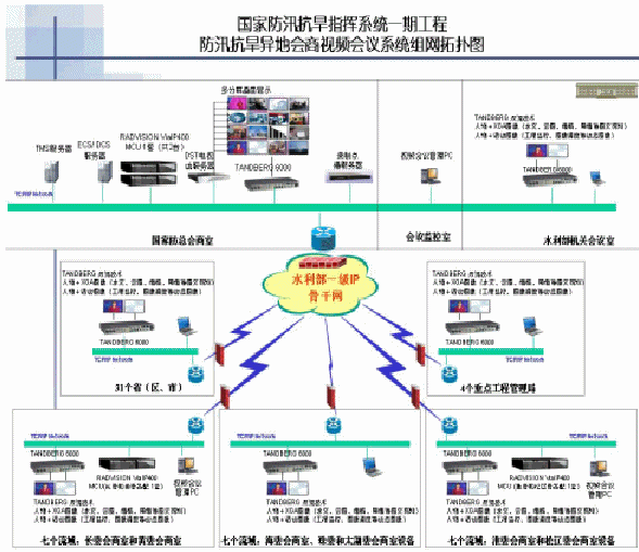 他們調(diào)查了當(dāng)時水利部及下屬機(jī)構(gòu)的網(wǎng)絡(luò)現(xiàn)狀:即將安裝的國家防汛抗旱指揮異地會商視頻會議系統(tǒng)會運(yùn)行在"國家防汛抗旱指揮系統(tǒng)"一期工程骨干網(wǎng)上,水利部網(wǎng)絡(luò)中心到7