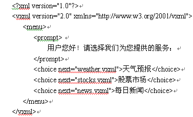 下面是一個(gè)VoiceXML簡單例子。當(dāng)用戶與電話語音系統(tǒng)接通以后,將會(huì)聽到語音合成的提示"用戶您好!請(qǐng)選擇我們?yōu)槟峁┑姆⻊?wù):" 。當(dāng)用戶說"股票市場"