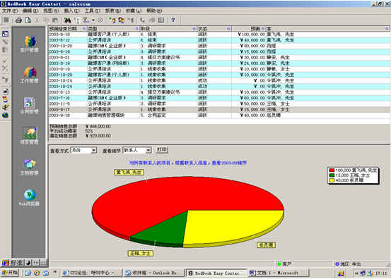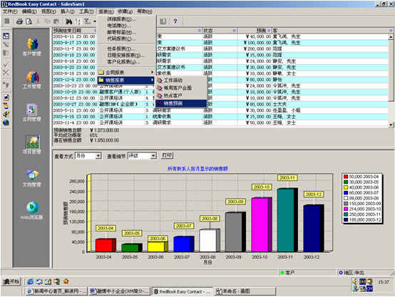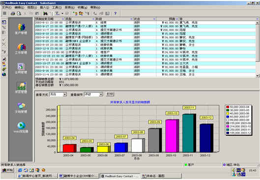 可根據(jù)月份、項(xiàng)目階段、聯(lián)系人、客戶(hù)、項(xiàng)目級(jí)別、銷(xiāo)售代表等條件進(jìn)行查看項(xiàng)目細(xì)節(jié),其中有詳細(xì)項(xiàng)目情況列表,也包括圖示。