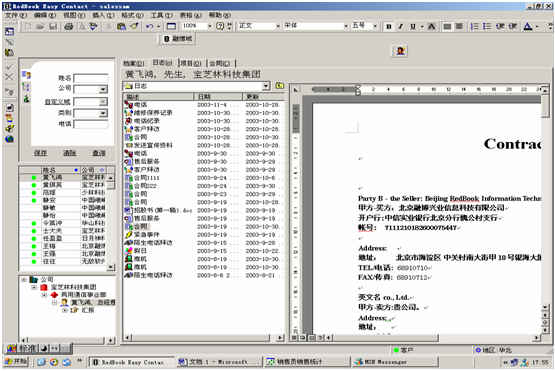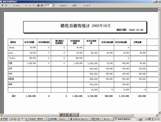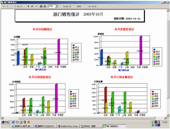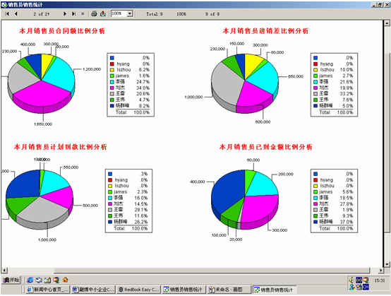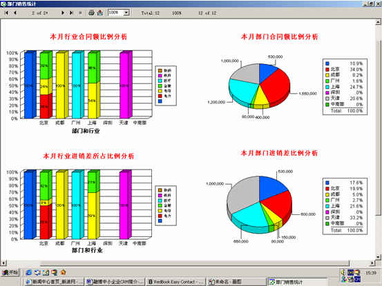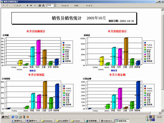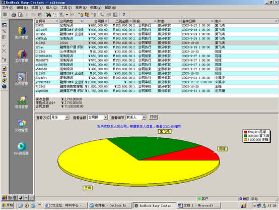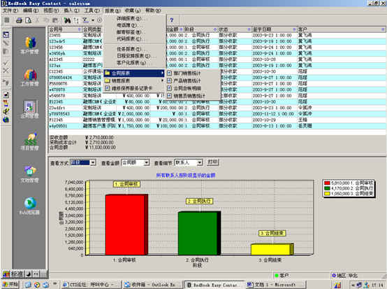 可對(duì)客戶(hù)(雇員)合同,根據(jù)合同階段、月份、合同金額、合同應(yīng)收應(yīng)付款、采購(gòu)成本、客戶(hù)、銷(xiāo)售人員等條件進(jìn)行查詢(xún)和統(tǒng)計(jì), 查詢(xún)統(tǒng)計(jì)結(jié)果以詳細(xì)列表及圖示進(jìn)行顯示。