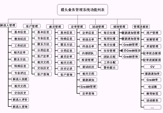 運(yùn)行于瀏覽器、跨地域信息公享;人力資源信息專業(yè)、覆蓋全面;系統(tǒng)功能強(qiáng)大、操作簡單方便;靈活配置,可擴(kuò)展性強(qiáng);復(fù)雜的業(yè)務(wù)關(guān)聯(lián)性及專業(yè)的業(yè)務(wù)報(bào)表。全部采用模塊化設(shè)置,包含了候選人管理、客戶管理、雇員管理、定單管理、活動管理、績效管理、統(tǒng)計(jì)報(bào)表和系統(tǒng)維護(hù)管理等模塊,以及幾十項(xiàng)具體業(yè)務(wù)功能細(xì)節(jié)。系統(tǒng)功能模塊明細(xì)表如下: