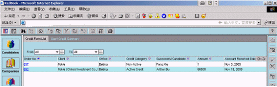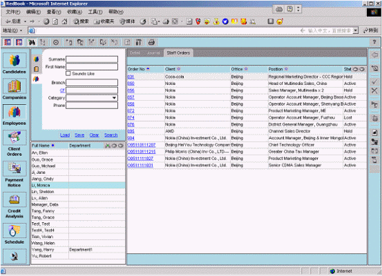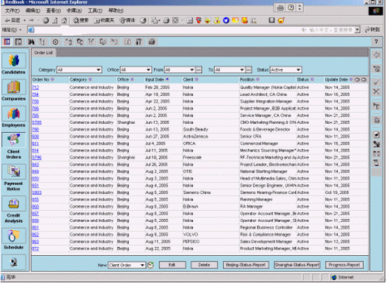 融博獵頭業(yè)務(wù)管理系統(tǒng)已經(jīng)被某著名的獵頭公司正式上線,該系統(tǒng)同時在北京、上海等五個分公司使用。根椐使用客戶反映,該系統(tǒng)功能強(qiáng)大、操作簡單,基本覆蓋了獵頭業(yè)務(wù)的全部內(nèi)容;各種業(yè)務(wù)流程規(guī)范、流暢;各類統(tǒng)計(jì)報(bào)表靈活、準(zhǔn)確;自動生成簡歷、客戶提交報(bào)告、催款通知、項(xiàng)目進(jìn)度報(bào)告,極大地提高了企業(yè)的工作效率。該系統(tǒng)與目前國際先進(jìn)的獵頭公司所使用的系統(tǒng)相比,處于領(lǐng)先的地位。