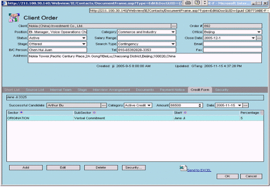 - Credit管理和查詢:根據(jù)雇員定單完成情況,賦予一定比例的傭金提成,自動生成相關(guān)文件,通知財(cái)務(wù)等相關(guān)部門和管理者;