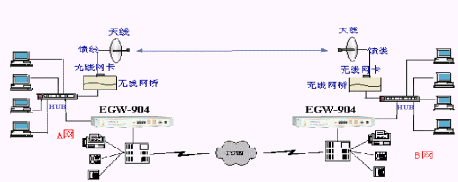 A網(wǎng)與B網(wǎng)分別為兩個局域網(wǎng),通過兩臺WavePoint II無線網(wǎng)橋?qū)蓚局域網(wǎng)連在一起,網(wǎng)橋上的RJ45口或BNC細纜接口與局域網(wǎng)相連。每臺網(wǎng)橋上插有一塊WaveLAN無線PC卡,PC卡的射頻輸出端口,通過饋線接到天線,通過PC卡來完成無線鏈路的連通。無線網(wǎng)橋連接完成后的效果類似HUB級連。IP語音網(wǎng)關(guān)-HGW-904的局域網(wǎng)接口(RJ45)連接到局域網(wǎng)的HUB上,根據(jù)用戶實際的話務(wù)量,選用Line端口接入用戶電話交換機(PBX),PBX接普通電話機和傳真機,并連接至電話公網(wǎng)(PSTN)。其中所需設(shè)備:HGW-904 IP語音網(wǎng)關(guān)2臺;PBX或電話機的配置可根據(jù)用戶實際需求;無線網(wǎng)橋2臺;無線網(wǎng)卡2塊;天線兩套;饋線若干。 此方案亦可應(yīng)用于兩個需要連接的局域網(wǎng)之間有障礙物遮擋而不可視的情況。此時只需在水平或垂直方向?qū)ふ乙粋能同時看到A與B的位置,并在此位置加入中繼網(wǎng)橋,即可實現(xiàn)A網(wǎng)與B網(wǎng)的連接。實際應(yīng)用中,設(shè)置各異地IP語音網(wǎng)關(guān)的對應(yīng)代碼,在PBX上設(shè)定代表撥打IP電話的數(shù)字,代表PSTN外線電話的數(shù)字。此無線組網(wǎng)方式其實就是已有企業(yè)網(wǎng)的方式,可以完美解決特定地區(qū)布線的困難。特別是廣東地區(qū),工廠特別多,發(fā)展也特別快。有非常多的客戶可以用這種方式來滿足數(shù)據(jù)傳輸及VOIP的需求。