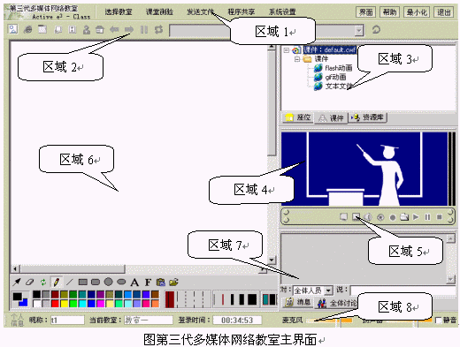 如圖所示,第三代多媒體網(wǎng)絡(luò)教室主界面主要包括以下幾個(gè)區(qū)域:
