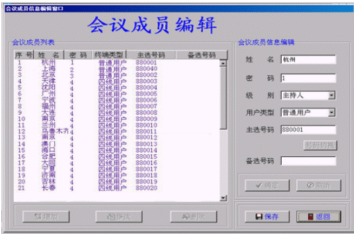 ·成員編輯:即設(shè)置會(huì)議成員數(shù)據(jù)。進(jìn)行會(huì)議操作之前必須先設(shè)置會(huì)議成員數(shù)據(jù)。會(huì)議成員數(shù)據(jù)包括:人員姓名、常用號(hào)碼、備用號(hào)碼、密碼、級(jí)別(會(huì)議主持人、發(fā)言人、聽眾)。會(huì)議主持人一個(gè),會(huì)議成員個(gè)數(shù)不限,但總數(shù)不超過(guò)180個(gè)。