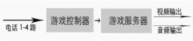 由于許多地區(qū),尤其是縣級市沒有信息平臺,而且許多電視臺愿與電話局直接合作。在這種情況下,電話局和電視臺合作對有線用戶公布 特服號碼,如123456,參與互動游戲的用戶,統(tǒng)一撥打該號碼,電話局提供四條用戶線給互動游戲系統(tǒng),同時對撥打123456的用戶都轉(zhuǎn)到這四條用戶線來,從而接入到互動游戲系統(tǒng),由系統(tǒng)給出語音提示引導用戶參與比賽。由于系統(tǒng)最多允許四個人參與比賽,當用戶滿時,撥打游戲熱線的用戶