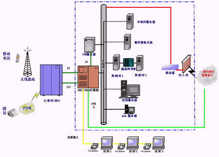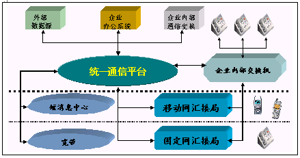 統(tǒng)一通信平臺(tái)提供了與企業(yè)內(nèi)部交換機(jī)(PBX)或PSTN,寬帶或INTERNET和GSM或GPRS網(wǎng)絡(luò)的接口,融合了多種網(wǎng)絡(luò)資源和企業(yè)內(nèi)部數(shù)據(jù)源。為用戶提供了多種服務(wù)界面:WEB界面、人工服務(wù)界面,IVR界面。同時(shí)為用戶提供短信息等數(shù)據(jù)業(yè)務(wù)。