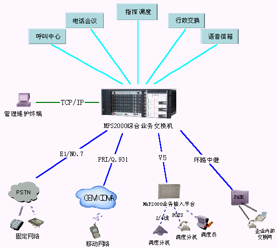 同時MPS2000綜合業(yè)務交換機能支持NO.7、NO.1、Q.931等在網運行的所有信令協議。