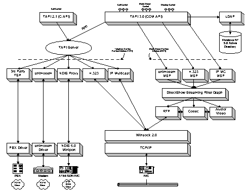 最新的TAPI 3.0基于微軟的COM標(biāo)準(zhǔn),它允許TAPI應(yīng)用程序采用包括JAVA?、Visual Basic?、Visual C++?在內(nèi)的各種語言進(jìn)行編寫,同時(shí)還可以方便的通過ActiveX技術(shù)將其移植到互聯(lián)網(wǎng)中去。TAPI除了支持傳統(tǒng)的電話應(yīng)用,還支持標(biāo)準(zhǔn)的H.323會(huì)議和IP多點(diǎn)會(huì)議,良好的QoS支持使得它增強(qiáng)了會(huì)議的質(zhì)量和網(wǎng)絡(luò)的可管理性。TAPI采用了統(tǒng)一的媒體流接口-DirectShowTM,TAPI媒體流提供商(MSP)只要針對(duì)不同的電話提供商(TSP)來實(shí)現(xiàn)DirectShowTM接口就可以被應(yīng)用程序使用。