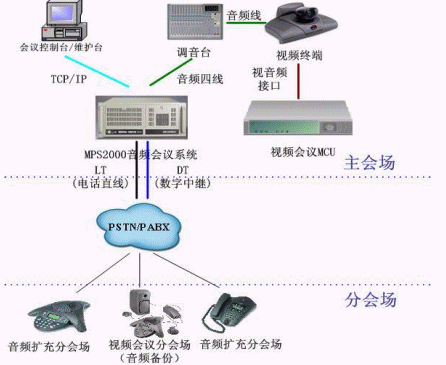 - MPS2000音頻會議系統(tǒng)通過音頻四線接口與主會場調音臺相連,保證視頻MCU中的音頻與音頻會議系統(tǒng)中的音頻互通。