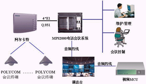國電中心的音頻電話會議系統(tǒng)采用MPS2000電話會議系統(tǒng)。MPS2000電話會議系統(tǒng)通過4個E1與阿爾卡特的4400交換機相連,采用Pri信令,用戶通過POLYCOM的會議終端機參加會議;MPS2000電話會議系統(tǒng)通過音頻四線與調音臺相連,并通過調音臺與視頻MCU相連,同時MPS2000電話會議系統(tǒng)通過以太網與其內部的局域網相連,同時在局域網內設置一臺維護終端用于對系統(tǒng)的維護管理,會議控制臺通過WEB方式對會議進行控制。