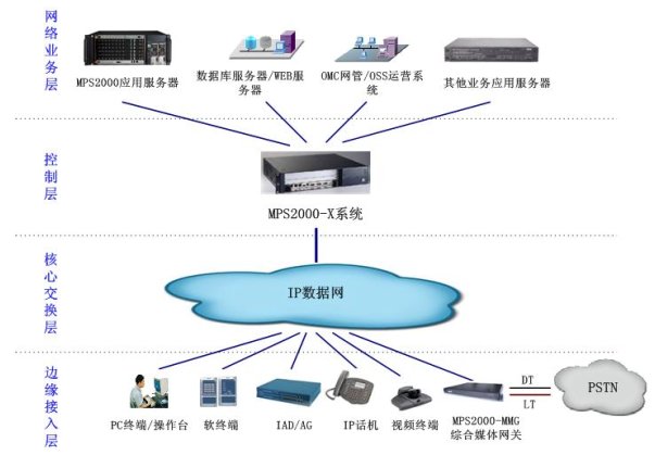 控制層:由MPS2000-X作為軟交換應(yīng)用,完成呼叫控制、媒體網(wǎng)關(guān)接入控制、資源分配、協(xié)議處理、路由、用戶認證、計費等功能,并可向用戶提供基本語音業(yè)務(wù)、增值語音業(yè)務(wù)、話務(wù)臺業(yè)務(wù)等。
