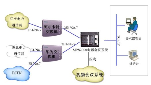 東北電網(wǎng)公司的電話會議系統(tǒng)中的120方會議橋通過4個E1采用中國七號信令與其原有的PABX相連,同時會議橋通過以太網(wǎng)與公司的內(nèi)部局域網(wǎng)相連,并在局域網(wǎng)內(nèi)設(shè)置一臺維護終端用于對系統(tǒng)的維護管理,局域網(wǎng)內(nèi)另一臺計算機可作為會議控制臺。電話會議終端直接與PABX相連。