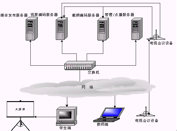 當老師端在異地時(攝像頭離服務器較遠,無法物理連接),可通過"電視會議系統(tǒng)"將老師的圖像及聲音實時傳送到編碼服務器,桌面課件可以通過PcAnywhere傳送到編碼服務器。圖像,聲音和桌面課件通過Web Streaming采集壓縮并在網上實時廣播。這種系統(tǒng)架構也是當今功能比較齊全和完善的一種實現(xiàn)方式。