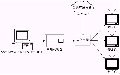 本系統(tǒng)接收端接收實時廣播時,除了用普通PC機收看,或把PC機接收到的信號輸到電視(大屏)上收看,甚至還可以接入有線電視網進行播放。具體方法是通過一個接收端接收股評節(jié)目,通過帶TV-OUT的顯卡把TV信號輸出到中頻調制設備,中頻調制設備可以把基帶模擬信號轉換成一個有線電視信號,且傳輸距離遠,損失小,再把這個信號與有線電視信號一起接入一個二分支器(2進1出),這就可以和公共有線電視共存,形成自己的頻道,供電視接收。