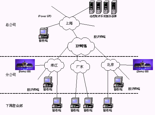 某證券公司有三級網絡,總公司、分公司和下屬營業(yè)部?偣镜椒止編捠2M,在總公司配置一套會議室型電視會議終端POLYCOM 970和一套多點會議服務器Radvision ViaIP400。在分公司配置了38套會議室型電視會議終端POLYCOM 680,用于與總公司進行雙向視頻會議。分公司到營業(yè)部帶寬是512K,各營業(yè)部安裝遠程股評系統(tǒng)接收端程序,遠程股評系統(tǒng)服務器都放置在海通總公司。當在總公司進行股評時,總公司本地攝像頭拍攝教師畫面,MIC采集教師聲音,傳給服務器編碼,再通過網絡供各個接收端接收;當在分公司進行股評時,首先分公司的電視會議設備采集教師畫面及聲音傳回總公司的電視會議設備,再傳給遠程股評系統(tǒng)的服務器進行編碼,然后通過網絡發(fā)布,供接收端接收。(結構如下圖)