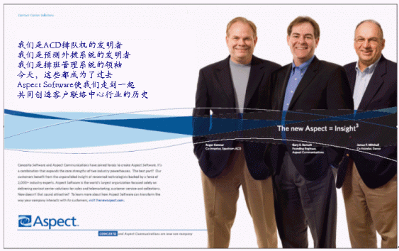 我們可以看到全新的Aspect Software將會給我們的客戶、合作伙伴以及我們的員工帶來更大的利益,我們擁有廣泛的解決方案、強(qiáng)大的研發(fā)團(tuán)隊以及支持隊伍,Aspect將會緊密地與您合作,在發(fā)展和實施呼叫中心解決方案的同時持續(xù)給您的業(yè)務(wù)帶來新的價值。