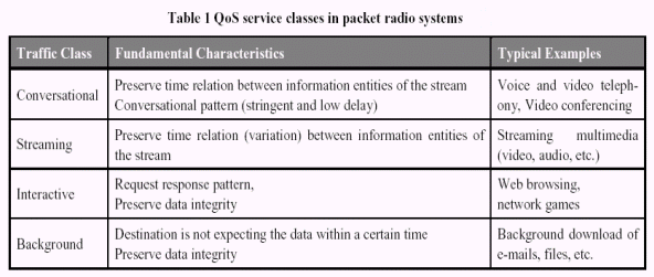 3G無(wú)線傳輸堆棧通常由二種不同類型的輸送介質(zhì)組成,專用和共享信道。然而,使用專用信道用戶可以獲得固定帶寬用于傳輸數(shù)據(jù),但使用共享信道用戶只有在動(dòng)態(tài)的帶寬下傳輸數(shù)據(jù),類似于ATM或GSM GPRS。HSDPA將會(huì)成為共享信道在空中的一個(gè)擴(kuò)展。除了MMS,在3G系統(tǒng)的初始階段所有的流媒體和會(huì)話應(yīng)用都希望使用專用信道。 在現(xiàn)代的系統(tǒng)設(shè)計(jì)中,一個(gè)應(yīng)用可以請(qǐng)求許多不同的服務(wù)質(zhì)量(QoS)級(jí)別的其中之一。服務(wù)質(zhì)量級(jí)別包含最大誤碼率、最大延遲和最大保證的帶寬等參數(shù)。此外,通常根據(jù)不同的應(yīng)用分為不同的服務(wù)級(jí)別:會(huì)話應(yīng)用、流媒體應(yīng)用、交互應(yīng)用以及后臺(tái)通信應(yīng)用。特性和典型的例子見表1。