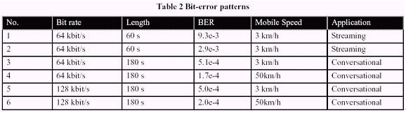 在H.264/AVC的標(biāo)準(zhǔn)化進(jìn)程中,移動(dòng)視頻傳輸?shù)闹匾砸呀?jīng)在3G移動(dòng)傳輸里面通過(guò)對(duì)基于H.324M的電路交換會(huì)話服務(wù)、包交換會(huì)話和流服務(wù)得到了證實(shí)。這些測(cè)試情況允許適當(dāng)?shù)木幋a特征、測(cè)試和容錯(cuò)仿真等特征的選擇,同時(shí)也可以得到有意義的測(cè)試結(jié)果。在本文,我們將會(huì)把重心集中在基于IP的測(cè)試情況。在正常的測(cè)試情況下,我們會(huì)定義6個(gè)測(cè)試情形組合,主要測(cè)試通過(guò)3G移動(dòng)網(wǎng)絡(luò)的包交換會(huì)話服務(wù)和包交換流媒體服務(wù)。另外,測(cè)試環(huán)境包括簡(jiǎn)單的脫機(jī)3GPP/3GPP2仿真軟件、程序接口和評(píng)估標(biāo)準(zhǔn)。無(wú)線信道使用專門生產(chǎn)用于移動(dòng)無(wú)線信道仿真的位率差錯(cuò)模板來(lái)進(jìn)行仿真。 位率差錯(cuò)模板在物理層上和RLC/RLP層下來(lái)捕獲,因此,它們?cè)趯?shí)驗(yàn)被用于物理層仿真。通過(guò)位率差錯(cuò)模板實(shí)驗(yàn)中得出的碼率、長(zhǎng)度、位錯(cuò)誤率和移動(dòng)速度數(shù)據(jù)詳見下表2。