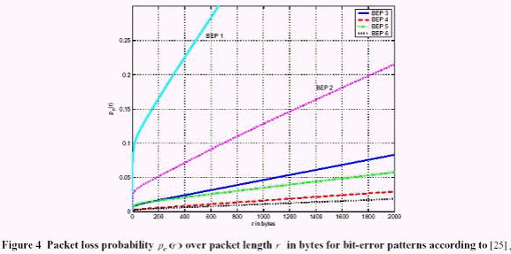 數(shù)組3到6的仿真結(jié)果更可靠,在會(huì)話應(yīng)用中需要低錯(cuò)誤率的運(yùn)送者。 假定一任意的字節(jié)的開始位置在文件包可能發(fā)生錯(cuò)誤的位置里面。 這些錯(cuò)誤可能性的所有數(shù)據(jù)錯(cuò)誤在圖4中被顯示。 明顯可以看出錯(cuò)誤率會(huì)因?yàn)榘L(zhǎng)度的增加而提高。從位率錯(cuò)誤表格(BEP1和2)可知,當(dāng)包長(zhǎng)度減少的時(shí)候丟包率是不可以接受的, 舉例來(lái)說(shuō),500個(gè)字節(jié), 丟失可能性高達(dá)25%. 高的錯(cuò)誤率需要在鏈路層上重傳。