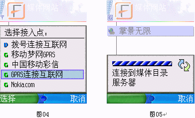 選擇" GPRS 連接互聯(lián)網"后,開始通過 GPRS 連接媒體目錄服務器,見下圖所示 :(圖04、05)