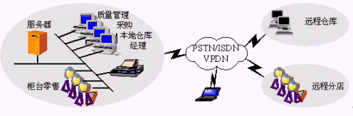 支持遠程庫房、遠程分店以及移動辦公。網(wǎng)絡拓撲結構與連鎖經(jīng)營企業(yè)基本相同。