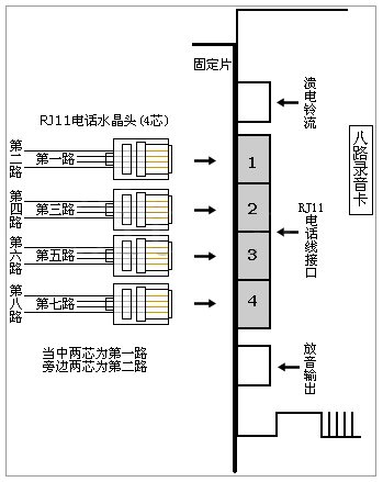 3. 8路錄音卡接線方式:(每個RJ11水晶頭,當(dāng)中兩芯為第一路,旁邊兩芯為第二路)