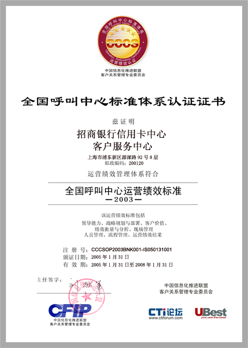 招商銀行信用卡中心客戶服務(wù)中心(800-820-5555)成立于2002年,是集電話服務(wù)熱線、傳真、電子郵件、短信服務(wù)以及互聯(lián)網(wǎng)等客戶溝通渠道于一體的多功能客戶服務(wù)中心,為所有招商銀行信用卡用戶提供365×24×7全年無休的優(yōu)質(zhì)客戶服務(wù),曾榮獲“2004中國最佳呼叫中心”稱號。作為中國銀行業(yè)率先加入CCCS標(biāo)準(zhǔn)認證體系的企業(yè),通過此次認證,一方面使得招商銀行客戶服務(wù)中心的運營管理水平進一步得到了提升和改善,實現(xiàn)規(guī)范化、精細化;另一方面,CCCS標(biāo)準(zhǔn)也從該公司在客戶服務(wù)和客戶關(guān)系管理方面所積累起來的寶貴實踐經(jīng)驗中汲取了養(yǎng)分,使CCCS標(biāo)準(zhǔn)能夠不斷地完善和發(fā)展。