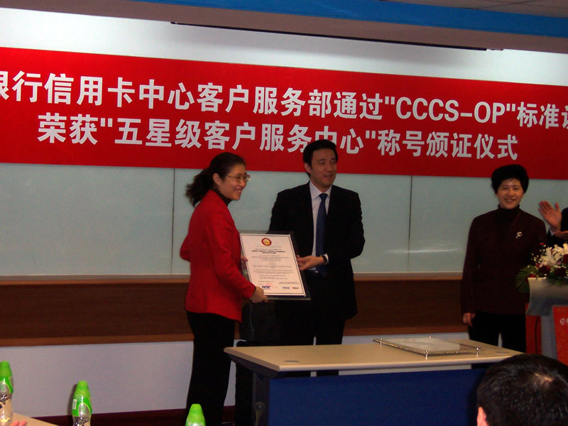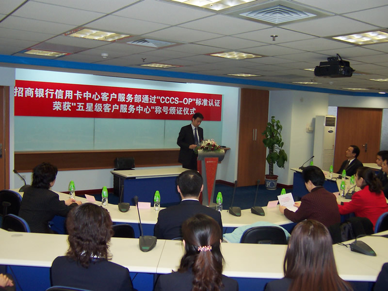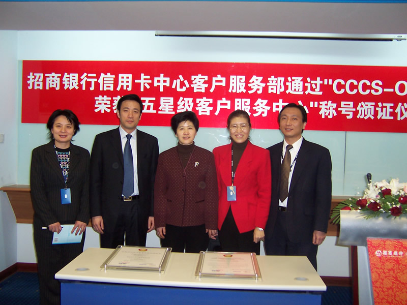經(jīng)過長達8個月時間的準(zhǔn)備和嚴格的認證審核,由中國信息化推進聯(lián)盟客戶關(guān)系管理專業(yè)委員會常務(wù)副主任郭晨東先生親自掛帥組成的項目評審專家小組從領(lǐng)導(dǎo)能力、戰(zhàn)略規(guī)劃與部署、客戶價值、績效衡量與分析、現(xiàn)場管理、人員管理、流程管理、運營績效結(jié)果等八個范疇對招商銀行信用卡中心客戶服務(wù)部進行了全面而嚴格的審核,涉及五大類上百項詳細的運營績效指標(biāo),歷經(jīng)初審評估、現(xiàn)場初審、初審評估報告提交與確認、標(biāo)準(zhǔn)試運行、績效全面提升、最終評審等階段,最終審核確認招商銀行信用卡中心客戶服務(wù)完全符合并部分超越《全國呼叫中心運營績效標(biāo)準(zhǔn)》(CCCS-OP-2003)的各項標(biāo)準(zhǔn)指標(biāo)和要求,于2005年1月31日正式批準(zhǔn)招商銀行信用卡中心通過該標(biāo)準(zhǔn)的五星級認證,授予“五星級客戶服務(wù)中心”稱號。