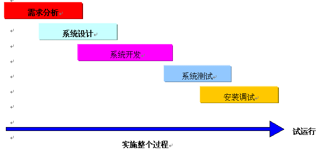 系統(tǒng)實施分階段進行,大致分為需求分析、系統(tǒng)設計、系統(tǒng)開發(fā)、系統(tǒng)測試、安裝調(diào)試、試運行及驗收。實施的具體時間表應有雙方單位根據(jù)實際情況商議確定。