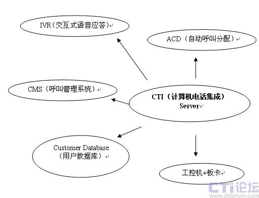 以CTI(計算機電話集成)為核心模塊,實現(xiàn)對IVR(交互式語音應答)、ACD(自動呼叫分配)、CMS(呼叫管理系統(tǒng))、板卡+工控機、Customer