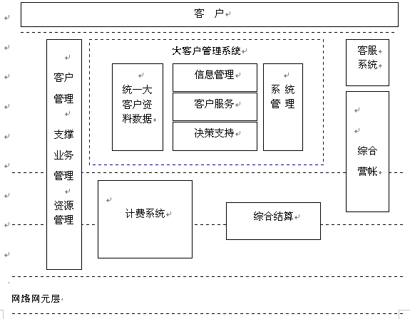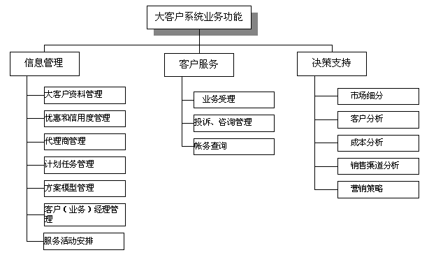 電信大客戶管理系統(tǒng)是在收集大客戶市場調(diào)查信息、大客戶資料信息、大客戶經(jīng)營戰(zhàn)略資源的基礎(chǔ)上,自動采集專業(yè)計費、綜合營帳、客服、網(wǎng)管、財務(wù)等系統(tǒng)的相關(guān)數(shù)據(jù),實現(xiàn)快速、全面、準確的新客戶業(yè)務(wù)受理、新增需求受理及故障處理過程通道,實現(xiàn)完善的客戶經(jīng)理管理、代理商管理系統(tǒng),最終實現(xiàn)完整的大客戶滿意度評估體系和針對大客戶的個性化服務(wù)。建成后的系統(tǒng)從管理、服務(wù)、分析三方面出發(fā)主要應(yīng)具備信息管理、客戶服務(wù)、決策支持功能。