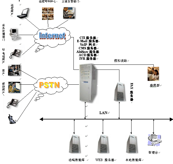 另一方面,CTI(計(jì)算機(jī)語音集成)技術(shù)的出現(xiàn),實(shí)現(xiàn)了通信技術(shù)與計(jì)算機(jī)技術(shù)的結(jié)合,利用計(jì)算機(jī)技術(shù)可以大大增加服務(wù)的信息量、提高速度、拓展新型客戶服務(wù)業(yè)務(wù)。因此為了滿足計(jì)算機(jī)、信息技術(shù)的演進(jìn)和客戶服務(wù)的需求,利用CTI技術(shù),面向用戶,提供綜合服務(wù)的客戶服務(wù)中心系統(tǒng)應(yīng)運(yùn)而生。對于用戶,客戶服務(wù)中心系統(tǒng)能夠提供更優(yōu)質(zhì)的用戶服務(wù),用戶能從服務(wù)方得到最快的響應(yīng),能夠得到24小時(shí)的持續(xù)服務(wù),能夠同時(shí)得到語音、圖象、數(shù)據(jù)多方面的信息支持。對于企業(yè),客戶服務(wù)中心在提高客戶服務(wù)質(zhì)量的同時(shí),還能有效的控制成本、增加收入,樹立專業(yè)化的企業(yè)形象,建立完善的客戶服務(wù)資料庫。